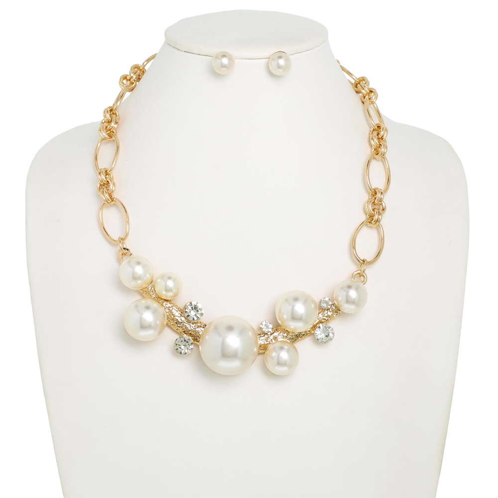 CRYSTAL RHINESTONE AND PEARL CLUSTER HAMMERED METAL ADJUSTABLE LINK BIB NECKLACE EARRING SET