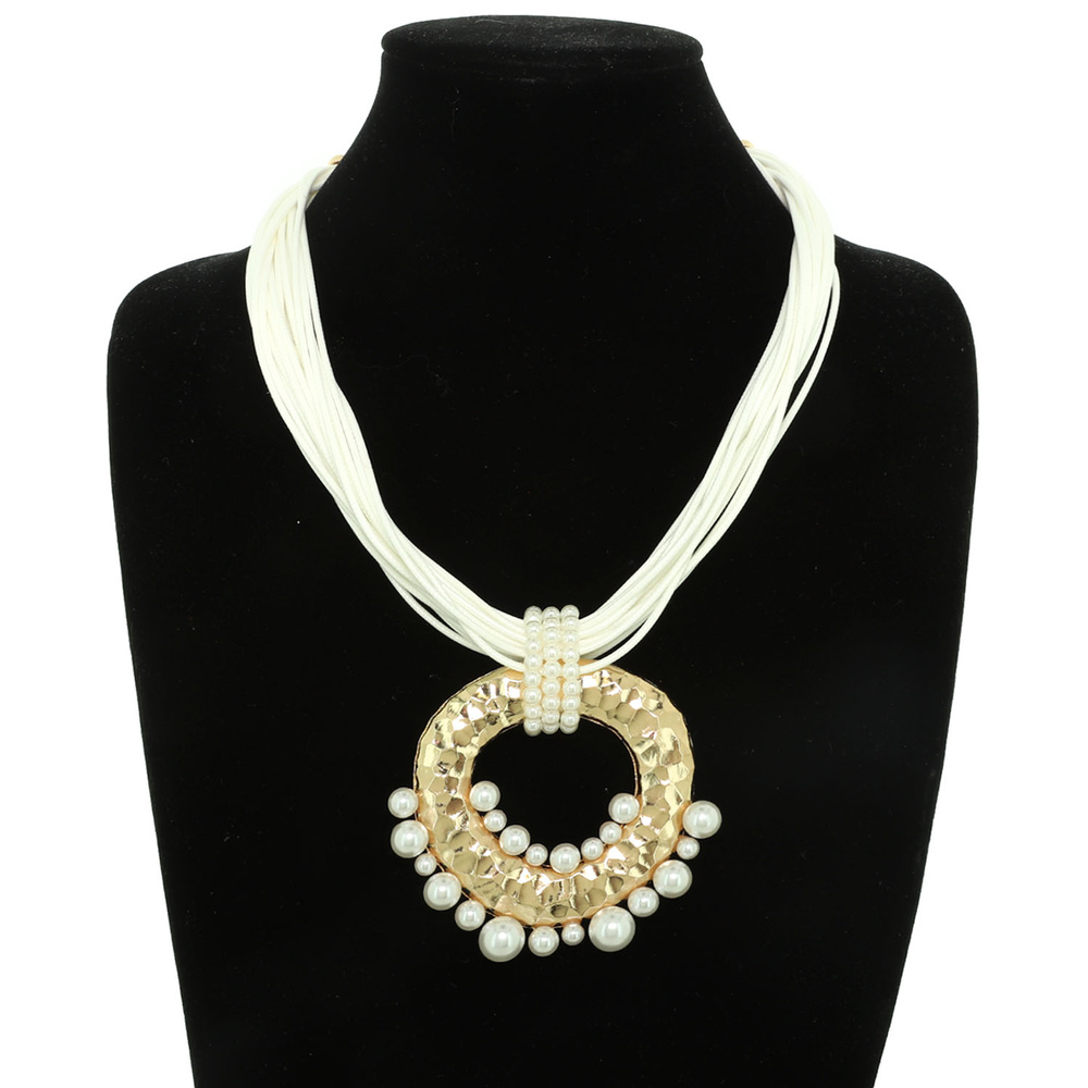 MULTI STRAND PEARL BEADED NECKLACE WITH HAMMERED GOLD TONE METAL DISC PENDANT