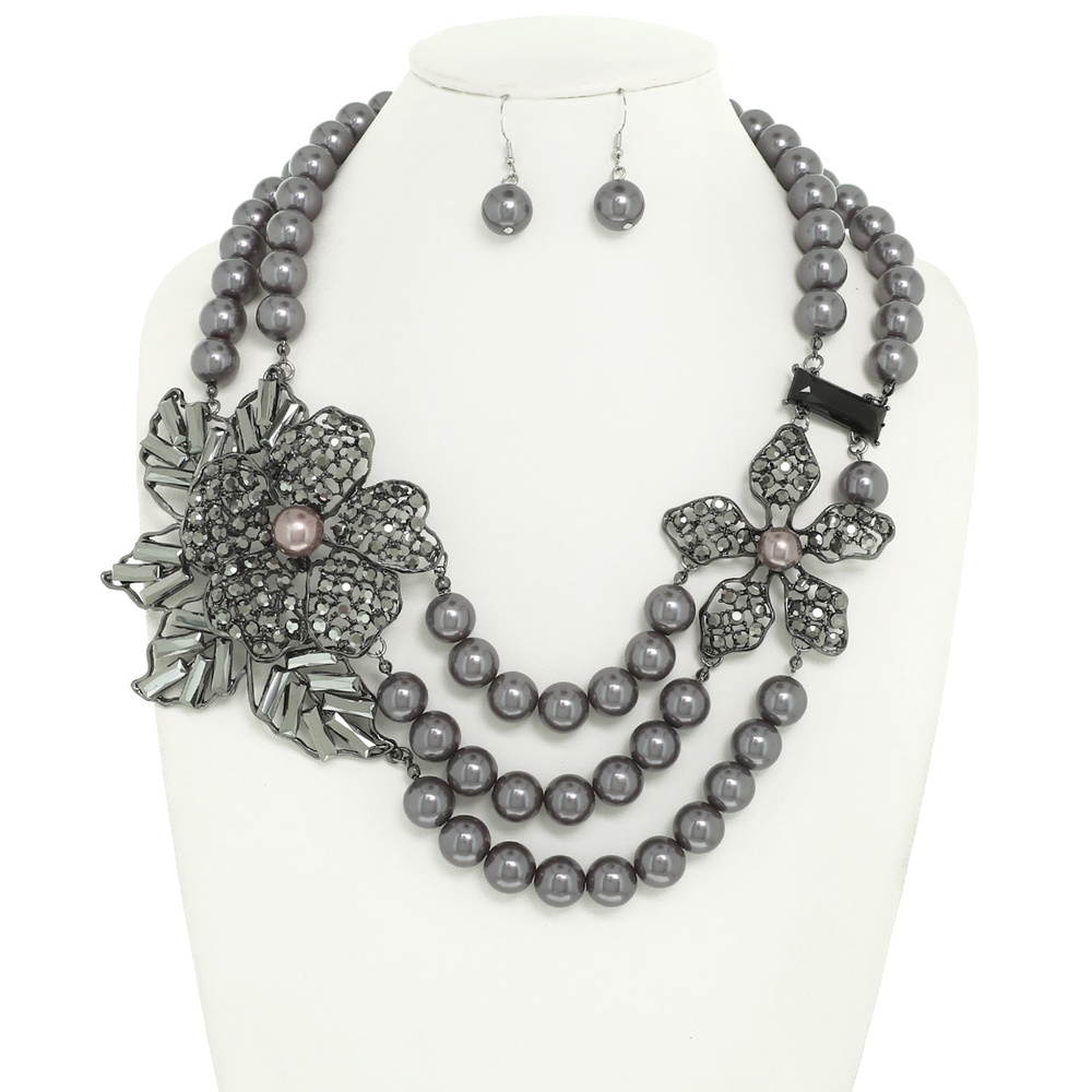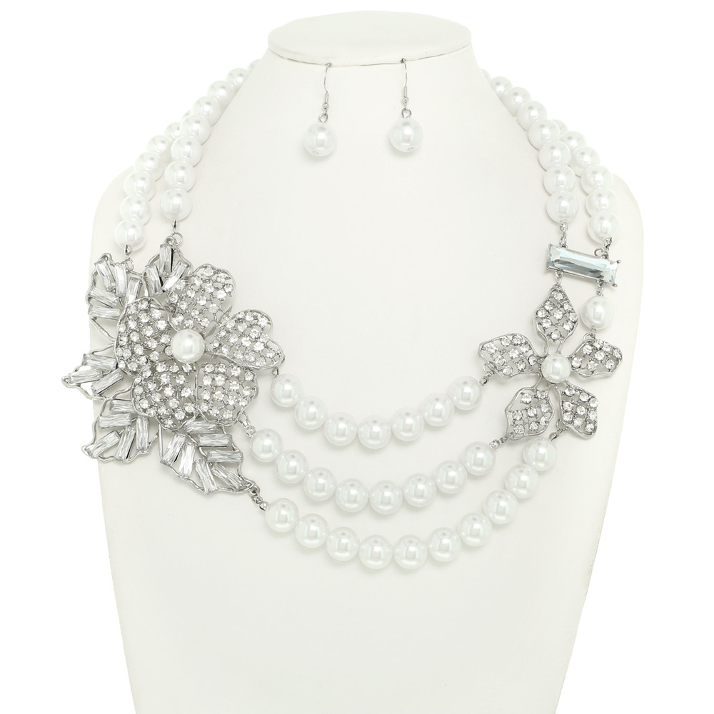 DUAL STRAND RHINESTONE FLOWER PEARL NECKLACE EARRING SET