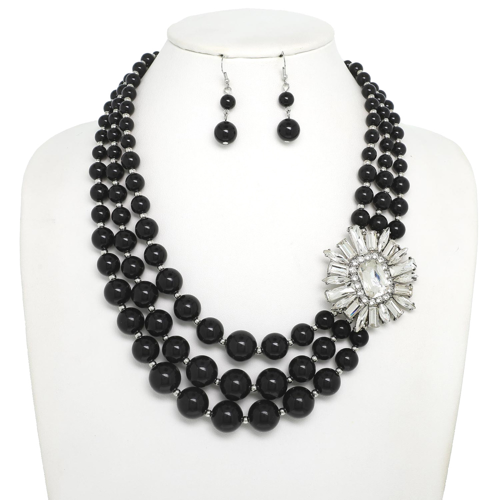 3 LINE CLASSIC FLORAL OCTAGON CUT CRYSTAL GEMSTONE BROOCH MULTI STRAND ADJUSTABLE PEARL COLLAR NECKLACE EARRING SET