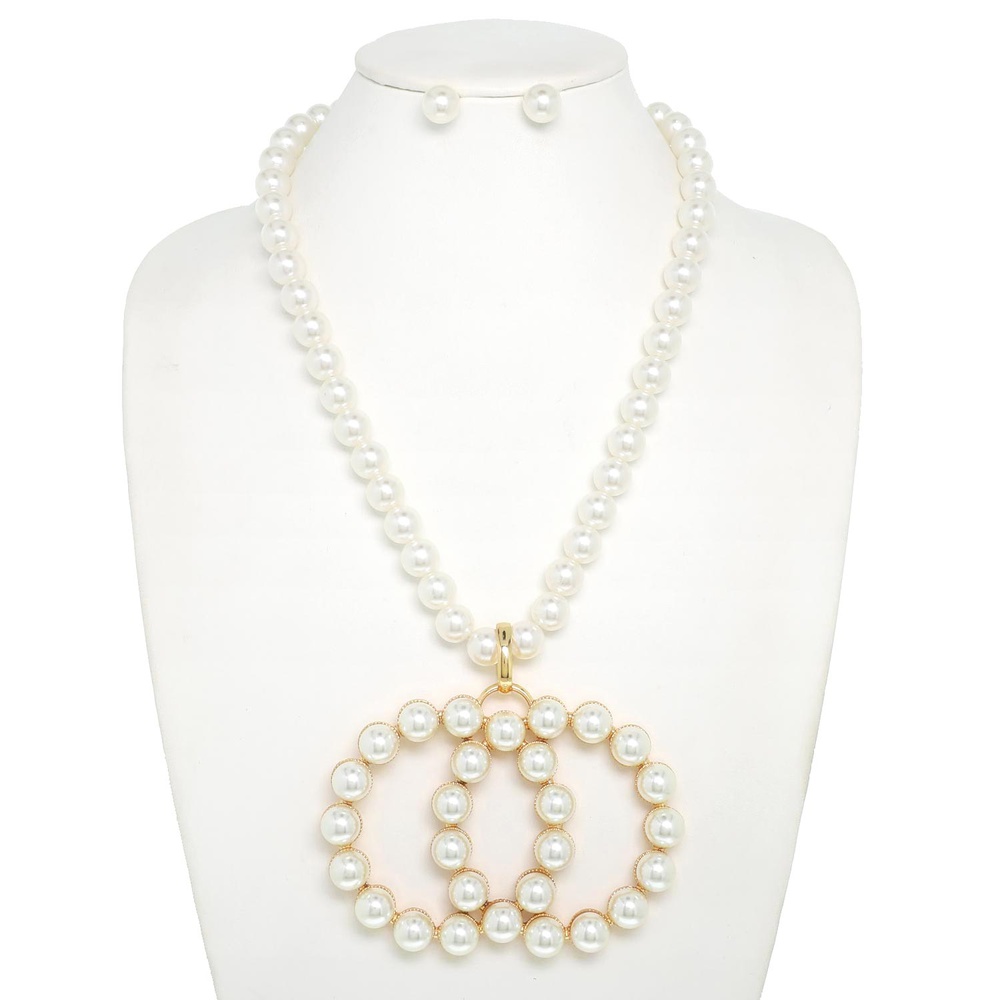 PEARL SINGLE STRAND INTERLOCKING CIRCLE LARGE PENDANT ADJUSTABLE NECKLACE EARRING SET