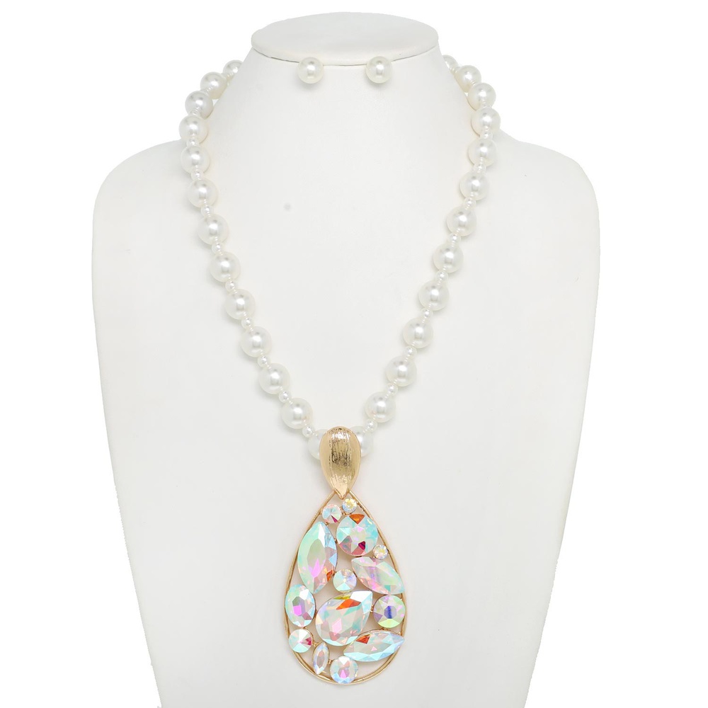 PEARL SINGLE STRAND AB CRYSTAL GEMSTONE TEARDROP CLUSTER ADJUSTABLE LARGE PENDANT NECKLACE EARRING SET