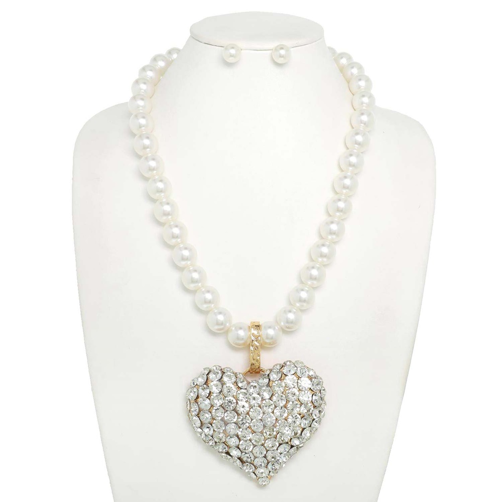Pearl Gemstone Cluster Heart Pendant Necklace Set