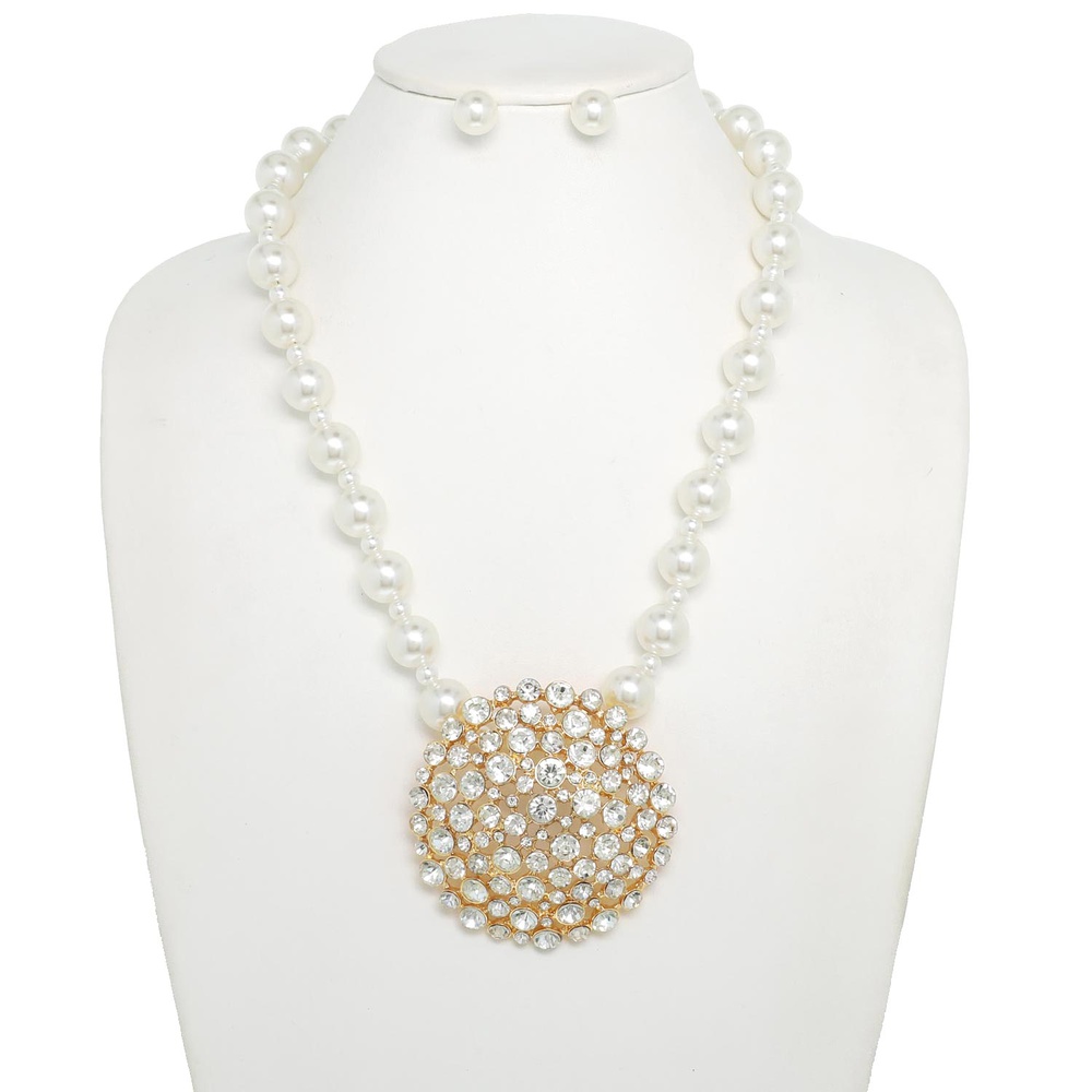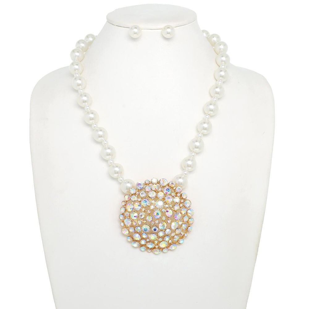 PEARL SINGLE STRAND AB CRYSTAL GEMSTONE CIRCLE CLUSTER LARGE ADJUSTABLE PENDANT NECKLACE EARRING SET