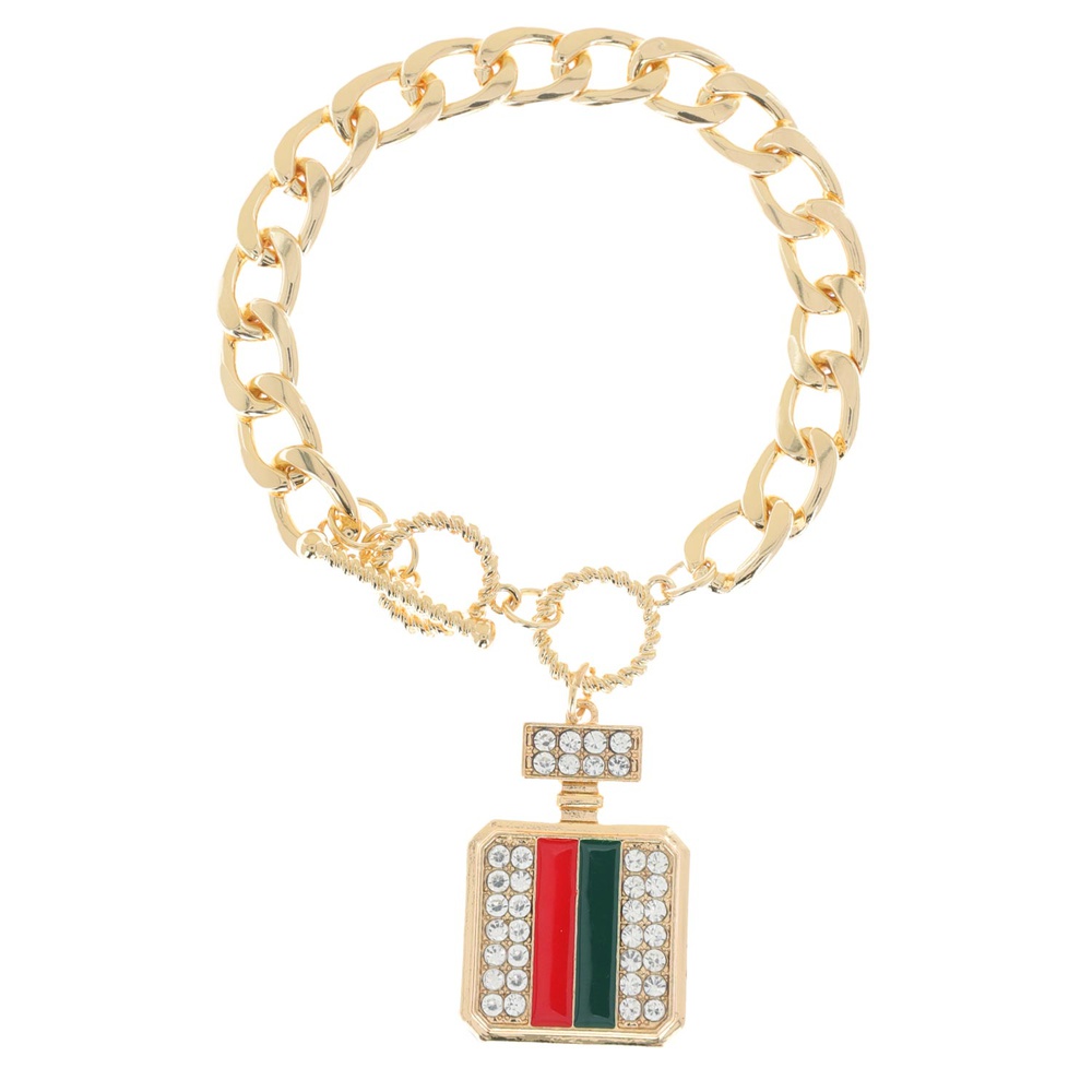FASHIONISTA CRYSTAL RHINESTONE ENAMEL COATED STRIPED PERFUME BOTTLE TOGGLE CHARM BRACELET IN GOLD TONE METAL