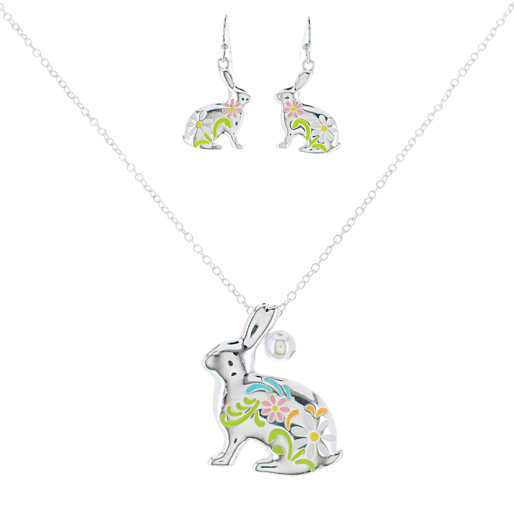 Easter Bunny Enamel Coated Floral Design Adjustable Pearl Pendant Chain Necklace Earring Set