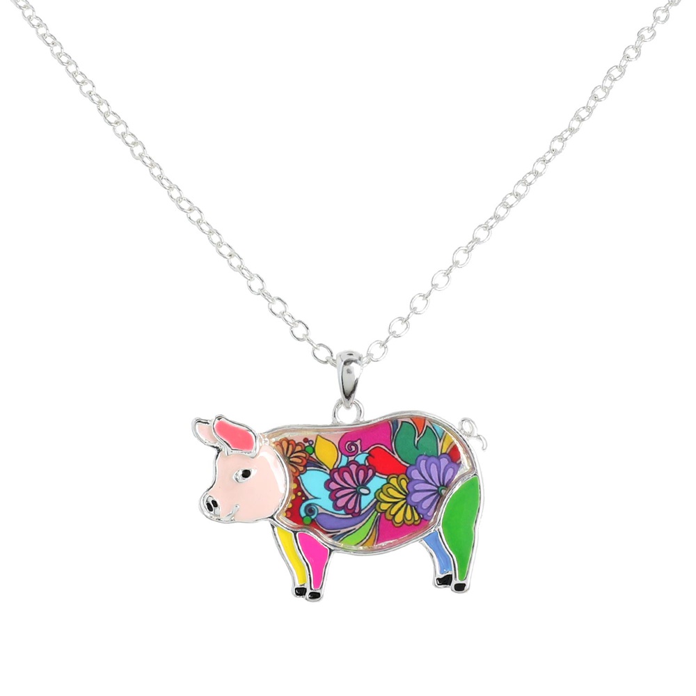 Western Multicolor Enamel Coated Pig Adjustable Pendant Necklace In Silver Tone Metal