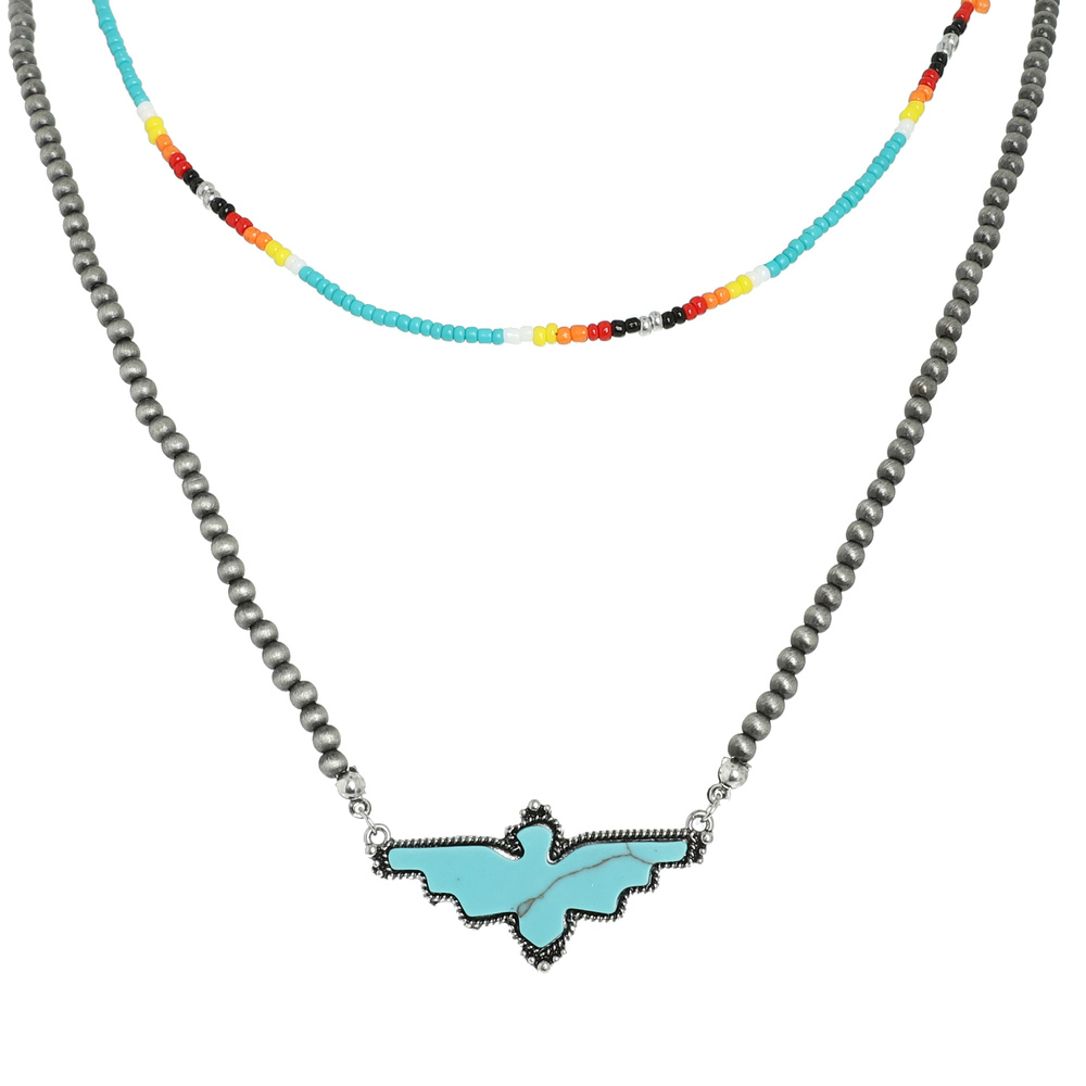 WESTERN MULTI STRAND NAVAJO PEARL SERAPE BEADED TURQUOISE SEMI STONE THUNDERBIRD ADJUSTABLE PENDANT NECKLACE IN SILVER TONE OXIDIZED METAL