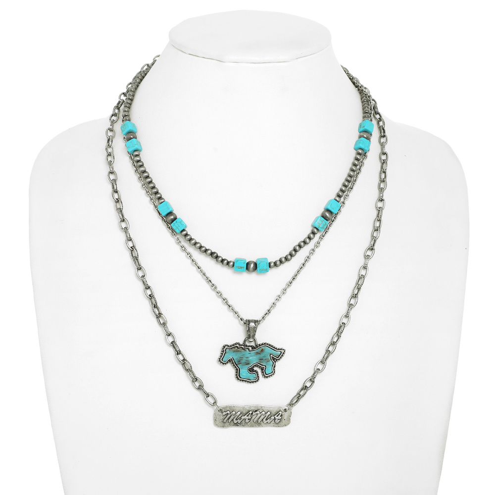 17" WESTERN MULTI STRAND NAVAJO PEARL BEADED TURQUOISE SEMI STONE "MAMA" RUNNING HORSE ADJUSTABLE PENDANT CHAIN NECKLACE IN SILVER TONE OXIDIZED METAL