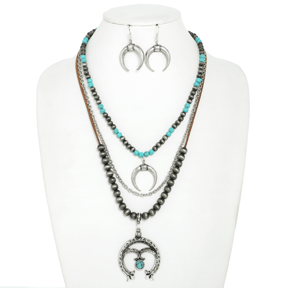 18" WESTERN MULTI STRAND NAVAJO PEARL BEADED ADJUSTABLE CHAIN LINK AND LEATHER CORD SQUASH BLOSSOM PENDANT NECKLACE EARRING SET IN OXIDIZED SILVER TONE METAL