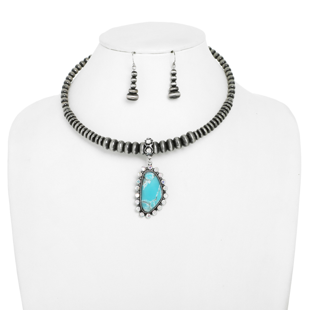 16" WESTERN NAVAJO PEARL BEADED CRYSTAL RHINESTONE ADJUSTABLE OVAL TURQUOISE PENDANT NECKLACE EARRING SET IN OXIDIZED SILVER TONE METAL