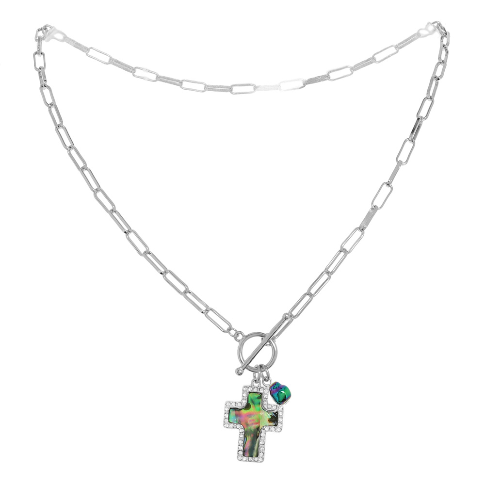 RHINESTONE EMBELLISHED PEARLOID INLAY CROSS BAROQUE PEARL PENDANT NECKLACE WITH TOGGLE CLASP