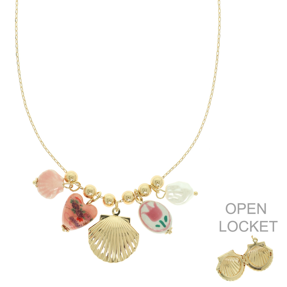 FLORAL HEART THEME ARTICULATED SEASHELL LOCKET CHARM NECKLACE IN GOLD-TONE METAL