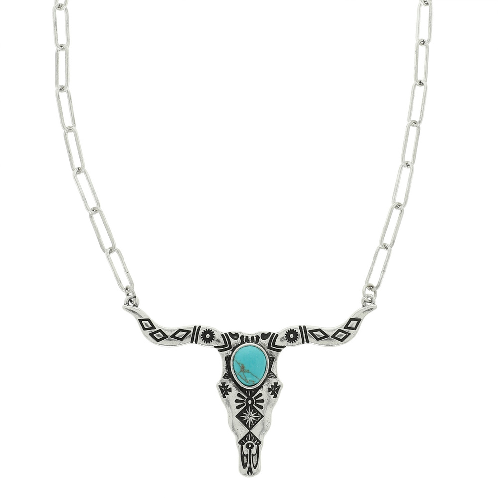 TURQUOISE EMBELLISHED LONGHORN PENDANT NECKLACE IN OXIDIZED SILVER-TONE METAL