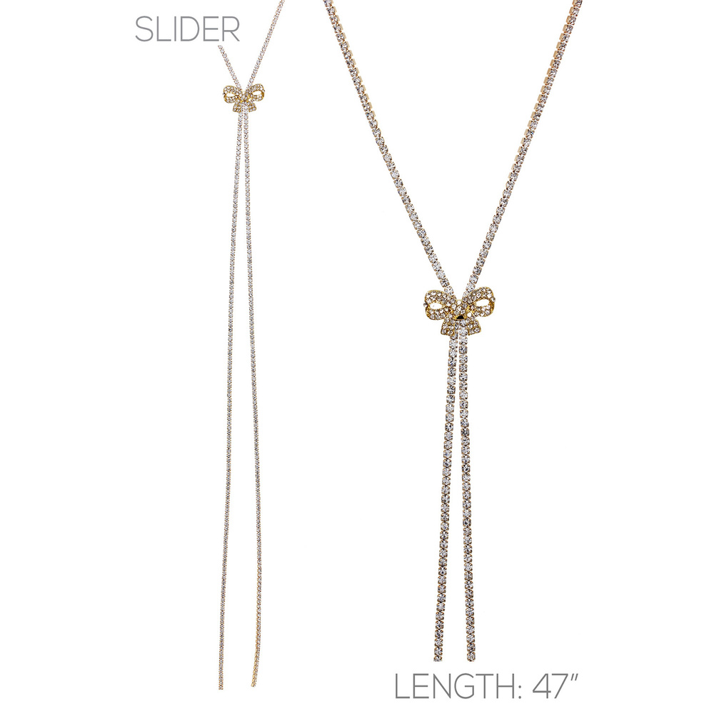 RHINESTONE PAVE BOW CHARM SLIDER BOLO NECKLACE