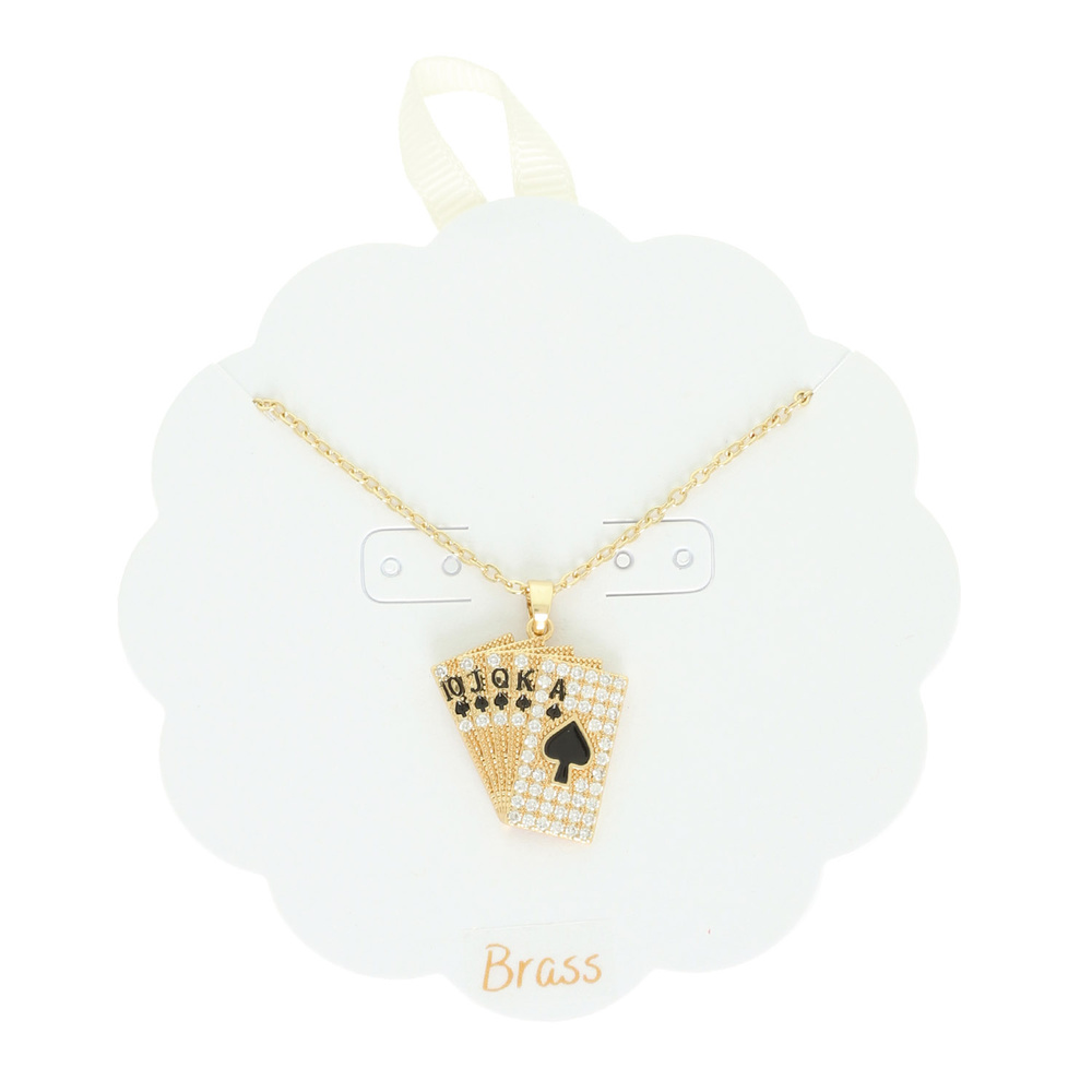 PLAYING CARD POKER HAND PENDANT NECKLACE WITH BLACK ENAMEL ACCENT AND GOLD TONE METAL