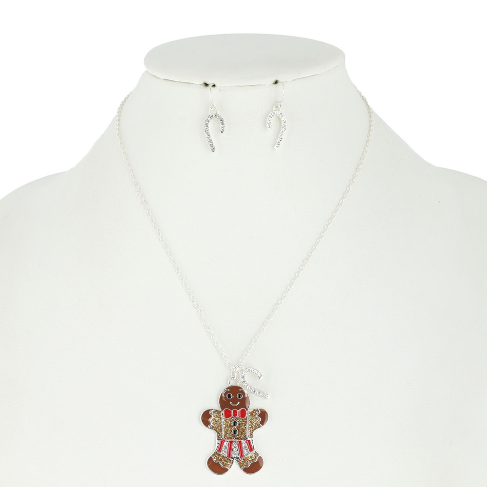 Christmas Gingerbread Man With Candy Cane Necklace And Earrings Set