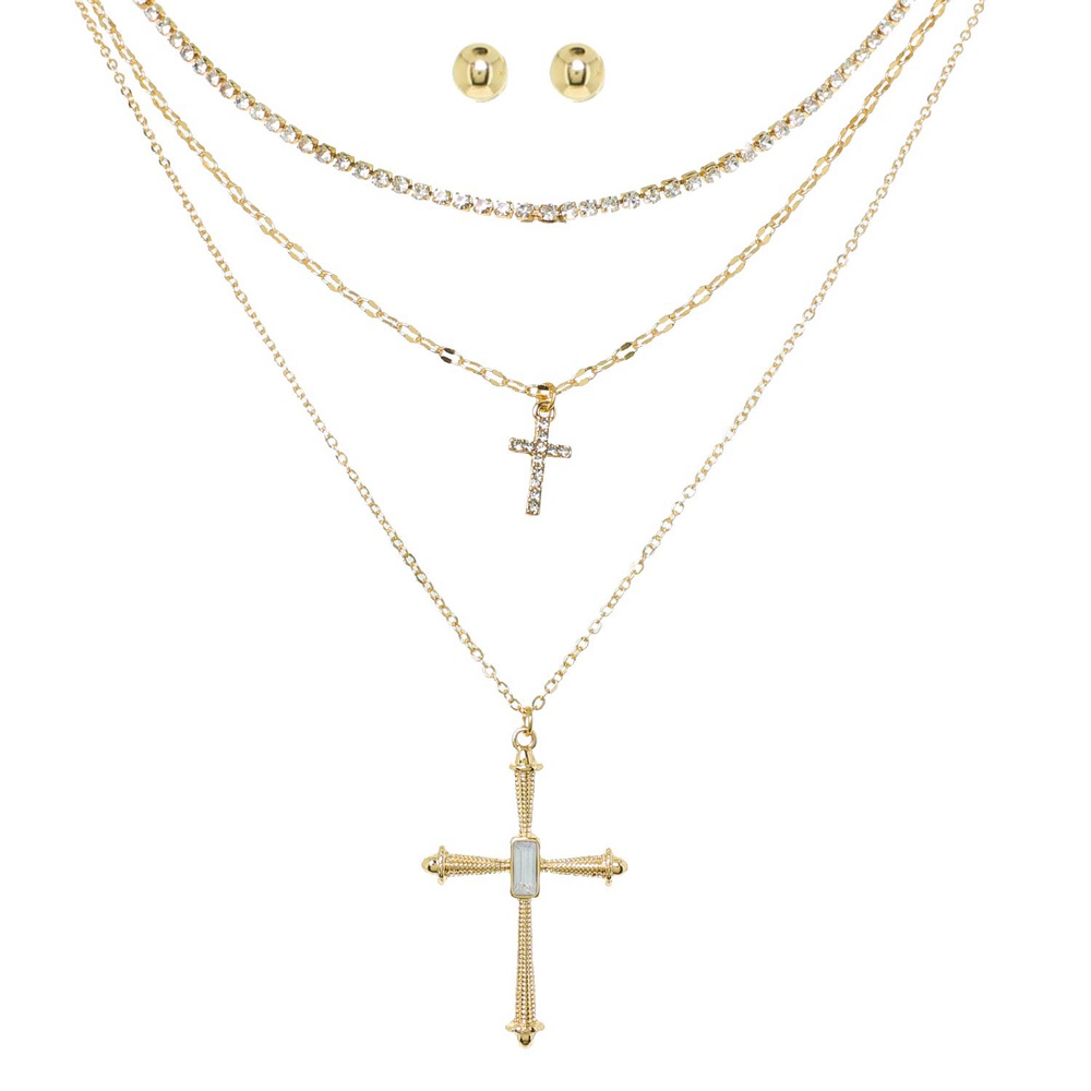 Cross Gold Tone Multi Strand Chain Necklace Set