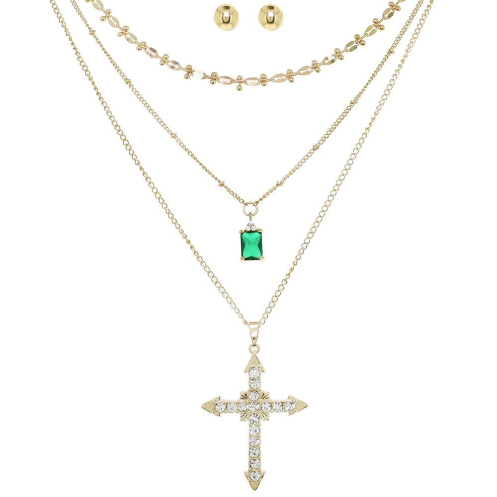 15.5" CRYSTAL RHINESTONE EMERALD CROSS MULTI STRAND ADJUSTABLE CHAIN NECKLACE AND STUD EARRING SET IN GOLD TONE METAL