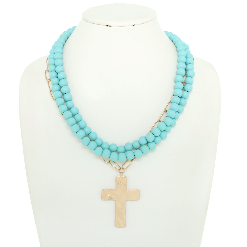 MULTI-STRAND CROSS PENDANT PEARL BEAD CHAIN NECKLACE
