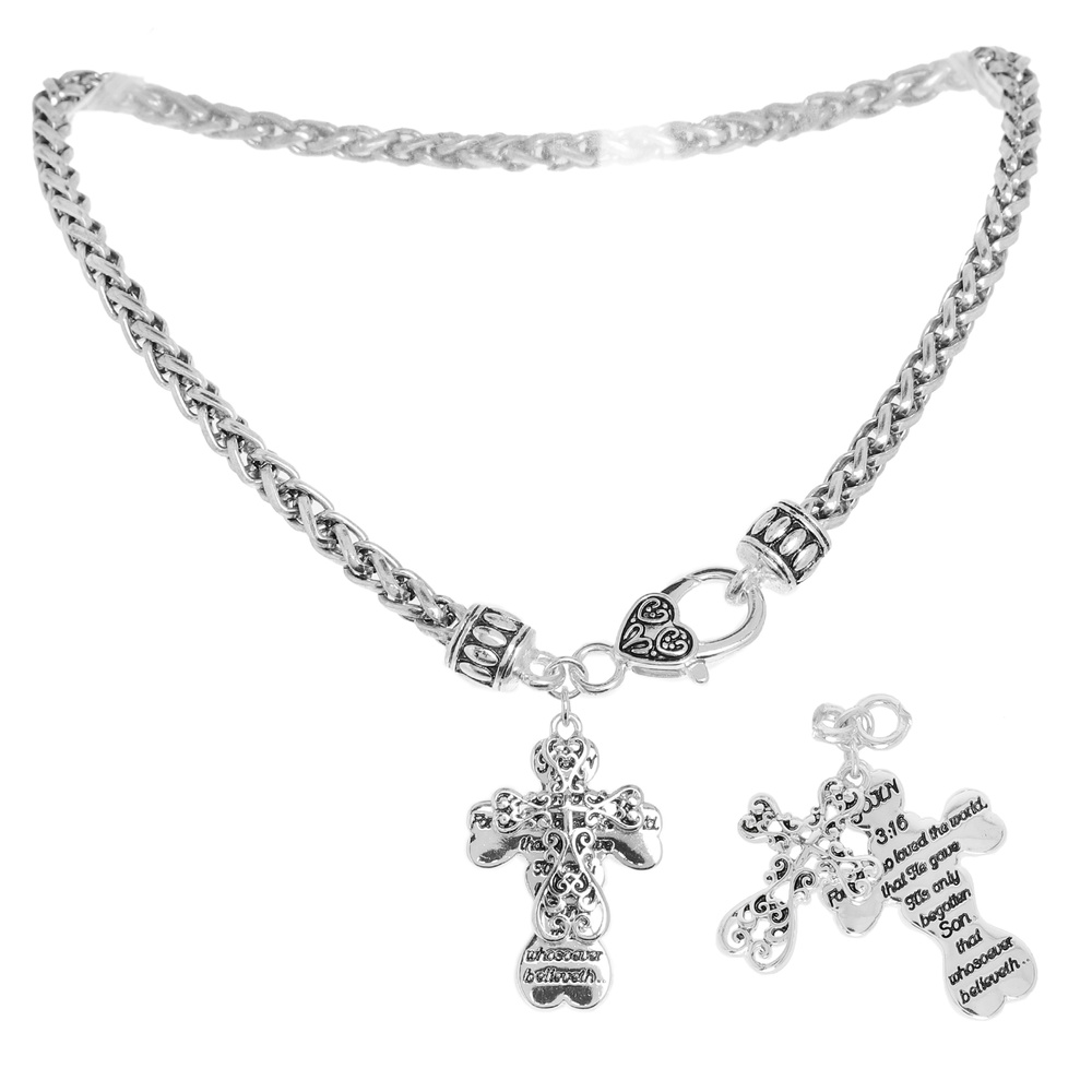 JOHN 3:16 INSCRIBED FILIGREE CROSS PENDANT WHEAT CHAIN NECKLACE