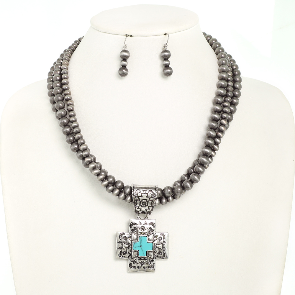 MULTI LAYERED WESTERN NAVAJO THEMED CROSS PENDANT BEAD NECKLACE EARRING SET