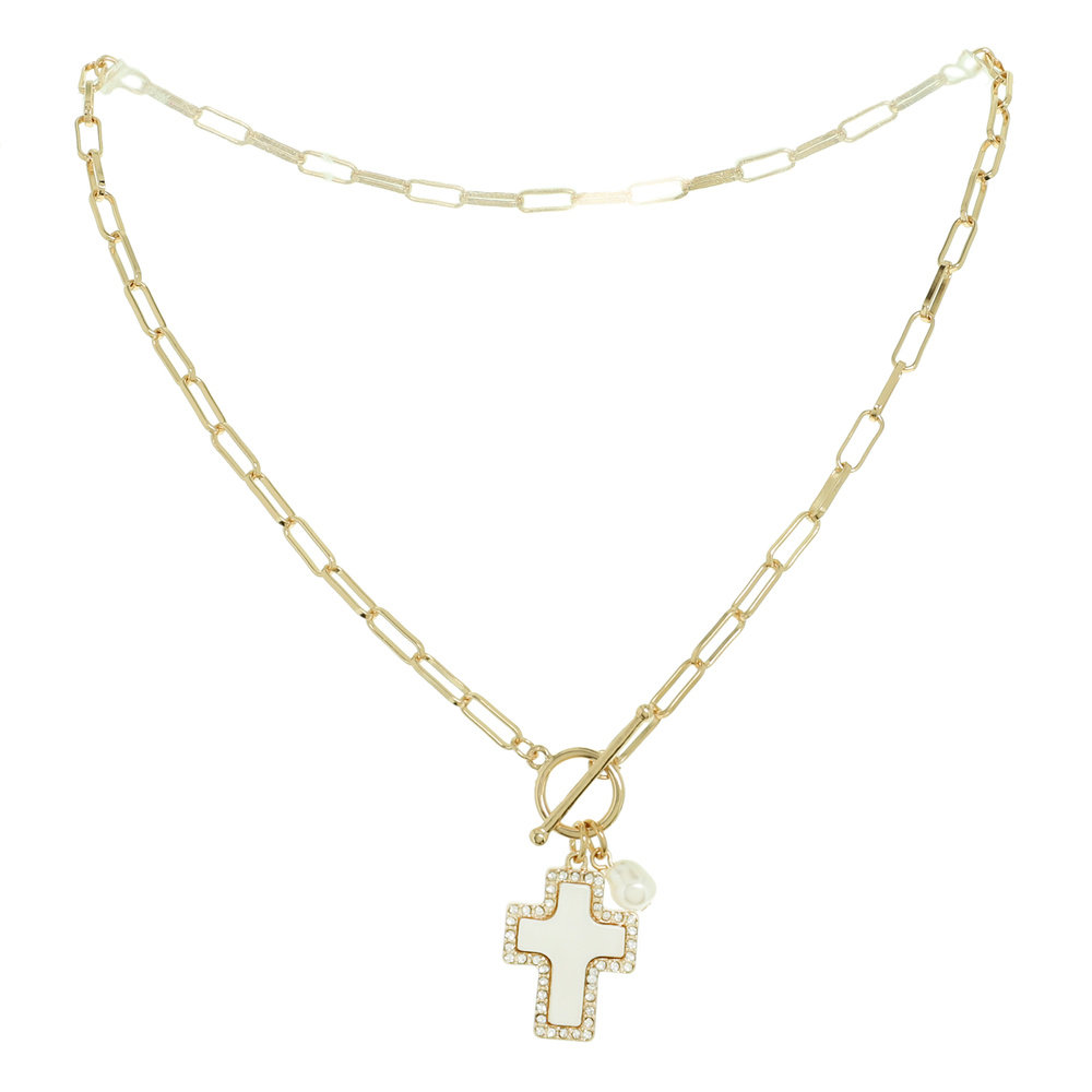 RHINESTONE EMBELLISHED PEARLOID INLAY CROSS BAROQUE PEARL PENDANT NECKLACE WITH TOGGLE CLASP