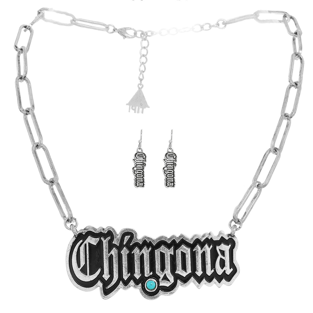 OLD ENGLISH FONT "CHINGONA" TURQUOISE PENDANT NECKLACE EARRING SET