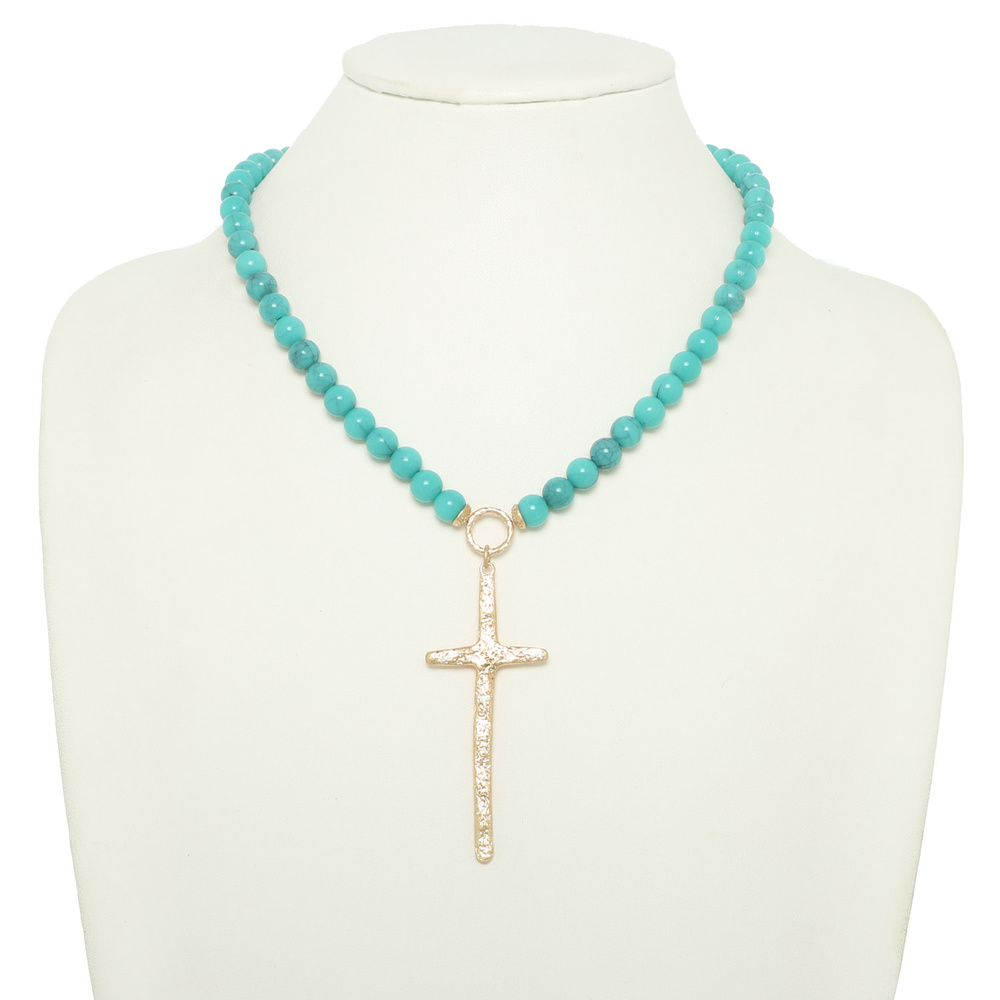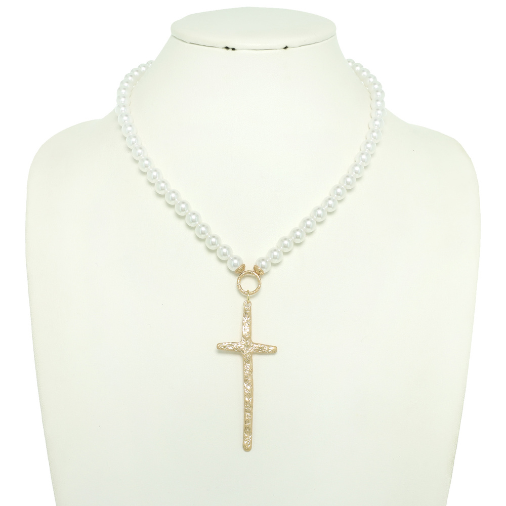 ROUGH TEXTURED FINISH LATIN CROSS PENDANT PEARLESCENT PEARL BEAD NECKLACE