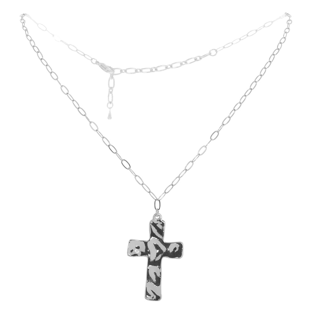 RUSTIC POLISHED CROSS PENDANT CHAIN NECKLACE IN SILVER-TONE METAL