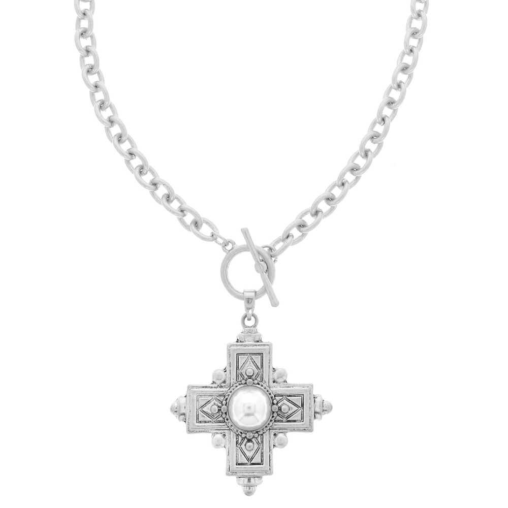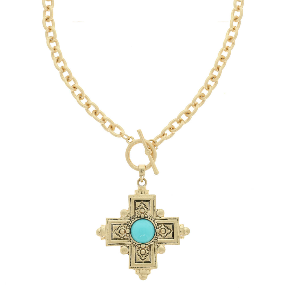 TURQUOISE EMBELLISHED CROSS TOGGLE NECKLACE IN SILVER-TONE METAL