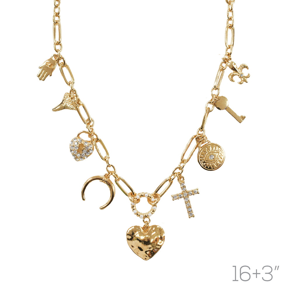 SYMBOLIC FAITH THEME RHINESTONE EMBELLISHED MULTI-CHARM NECKLACE