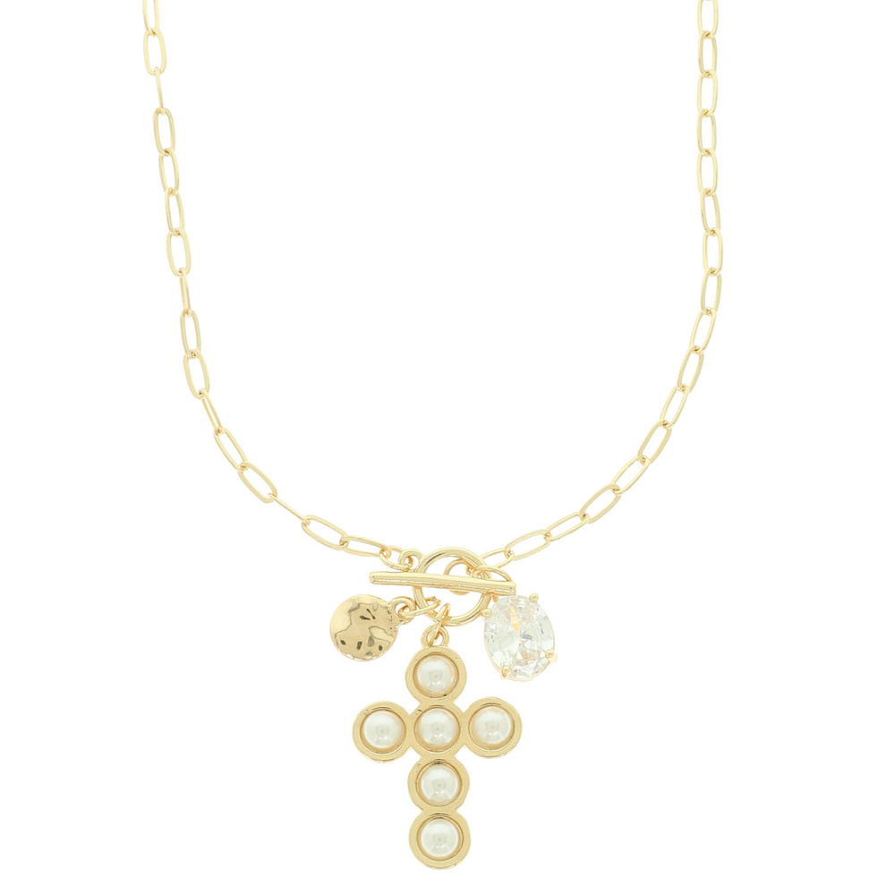 PEARL CRYSTAL EMBELLISHED CROSS CHARM NECKLACE WITH TOGGLE IN GOLD-TONE METAL