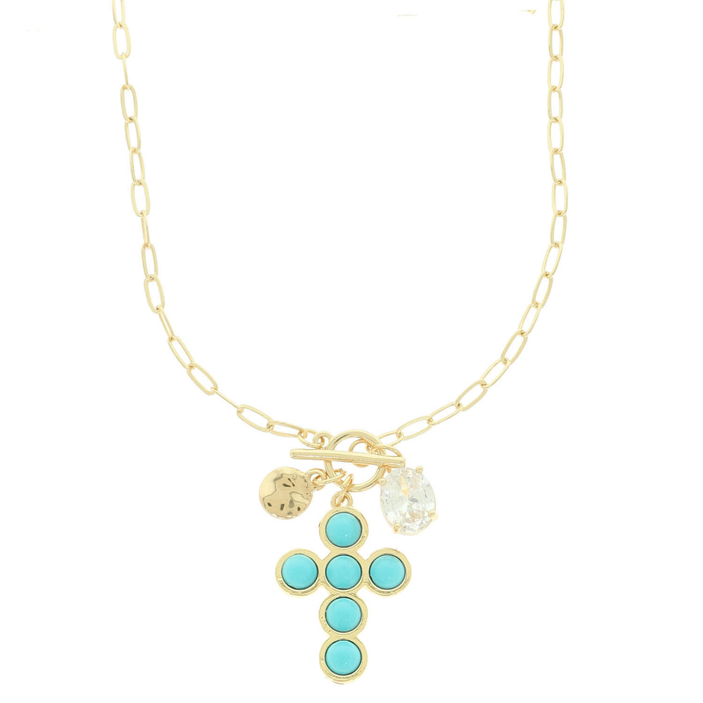 TURQUOISE CRYSTAL EMBELLISHED CROSS CHARM NECKLACE WITH TOGGLE IN GOLD-TONE METAL