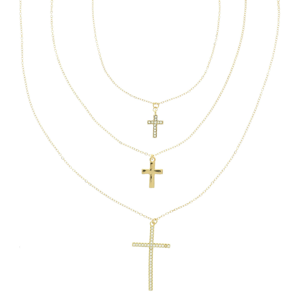 MULTI-STRAND CHANNEL-SET CRYSTAL CROSS PENDANT NECKLACE IN GOLD-TONE METAL