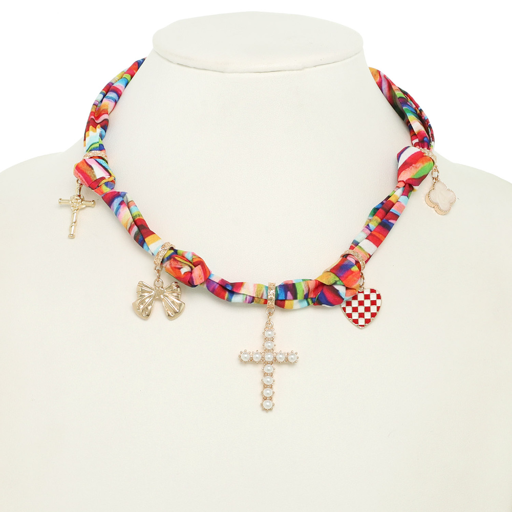 FAITH THEME SCARF NECKLACE WITH ASSORTED CHARMS INCLUDING CROSS BOW PEARL PAVED CROSS CHECKERED HEART AND OPALESCENT CLOVER