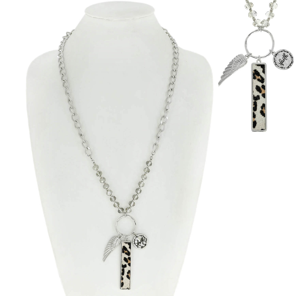 LEOPARD CHEETAH PRINT BAR WITH RELIGIOUS FAITH AND WING CHARM PENDANT NECKLACE