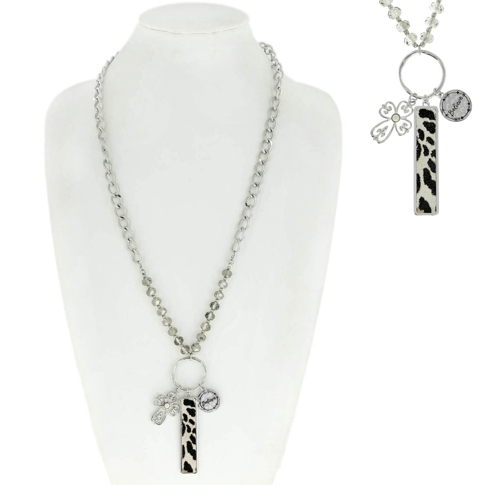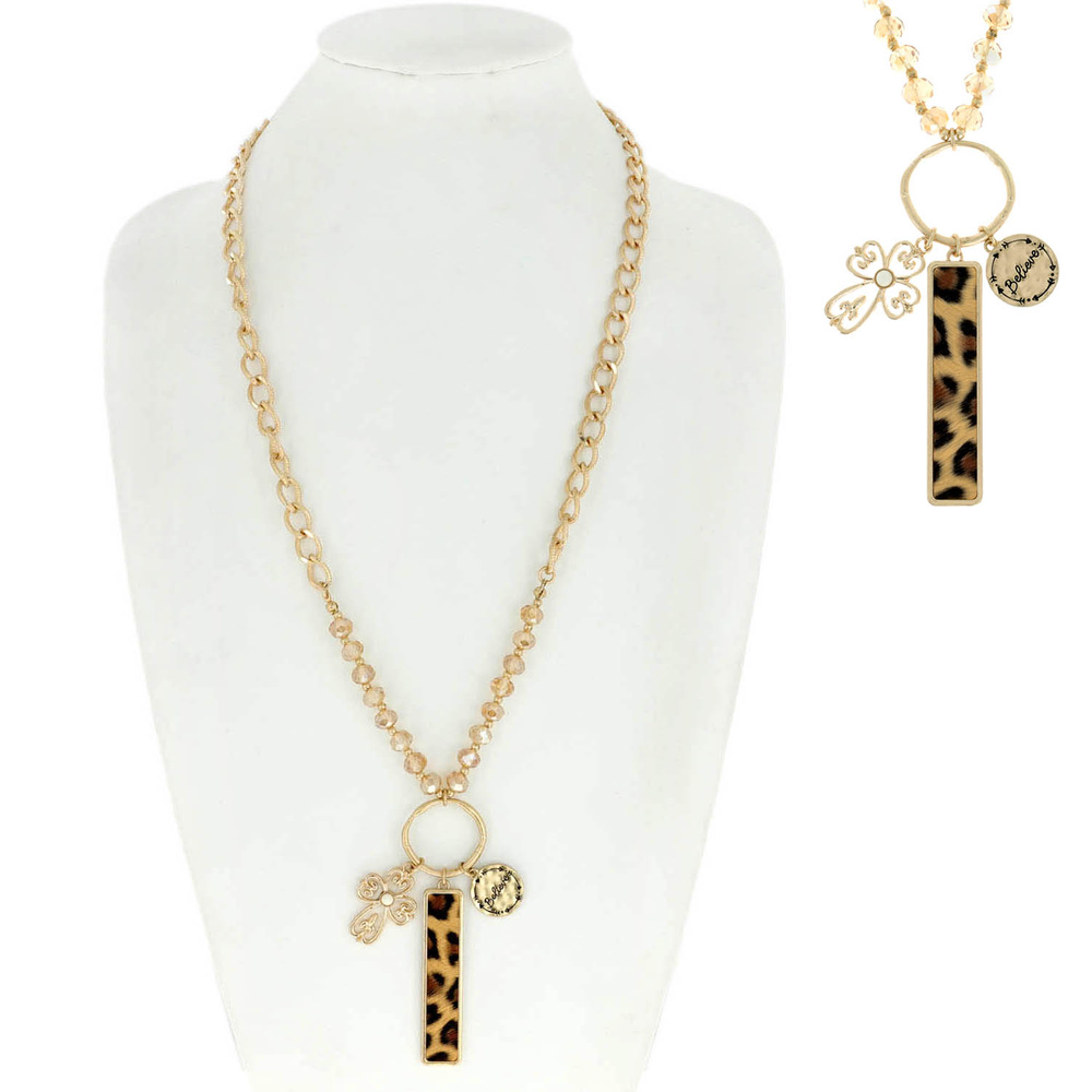 LEOPARD CHEETAH PRINT BAR WITH RELIGIOUS BELIEVE AND CROSS CHARM PENDANT NECKLACE