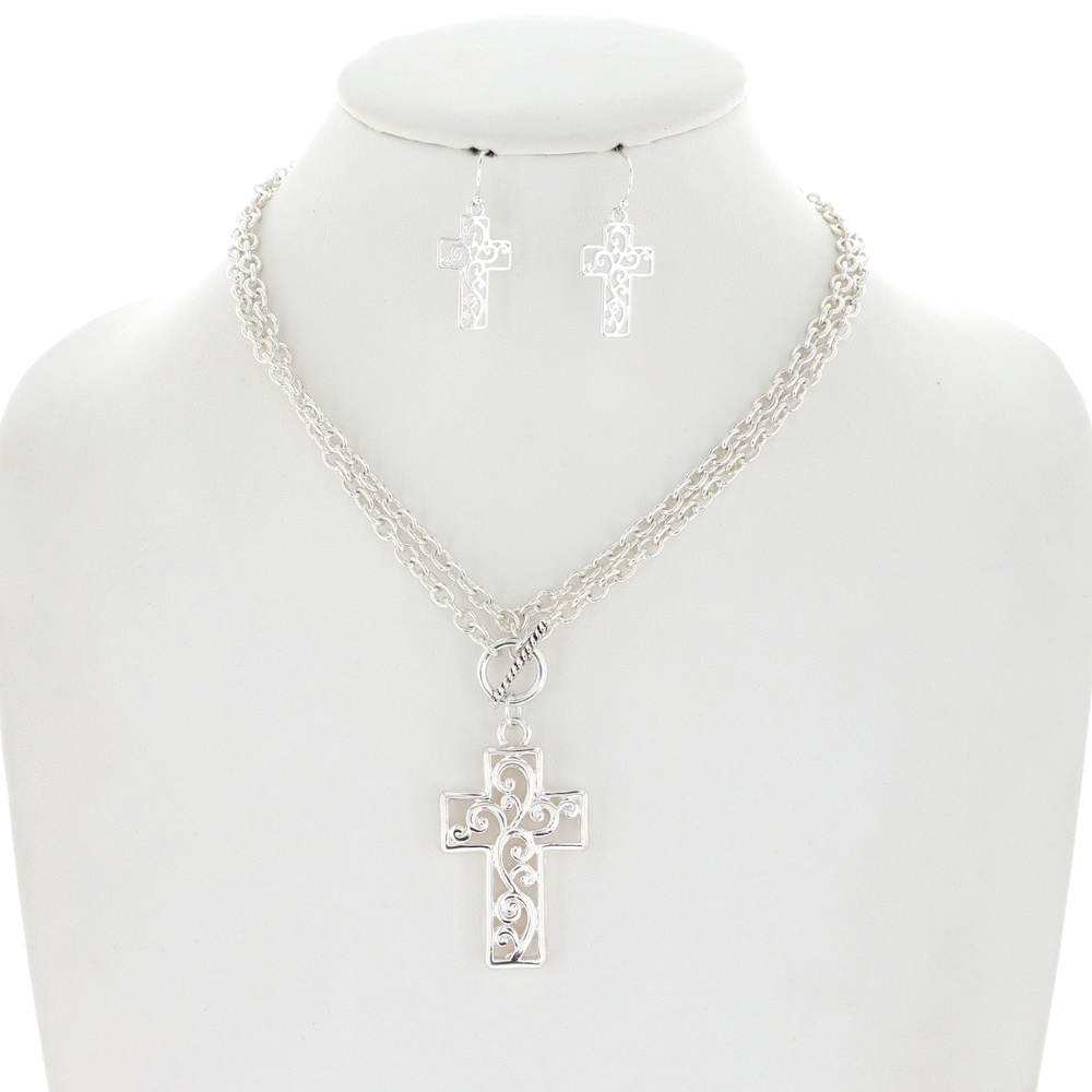 CROSS NECKLACE EARRING SET - OPENWORK SCROLL PENDANT WITH 2 LINE DOUBLE LAYER TOGGLE CHAIN NECKLACE