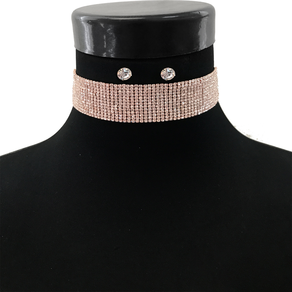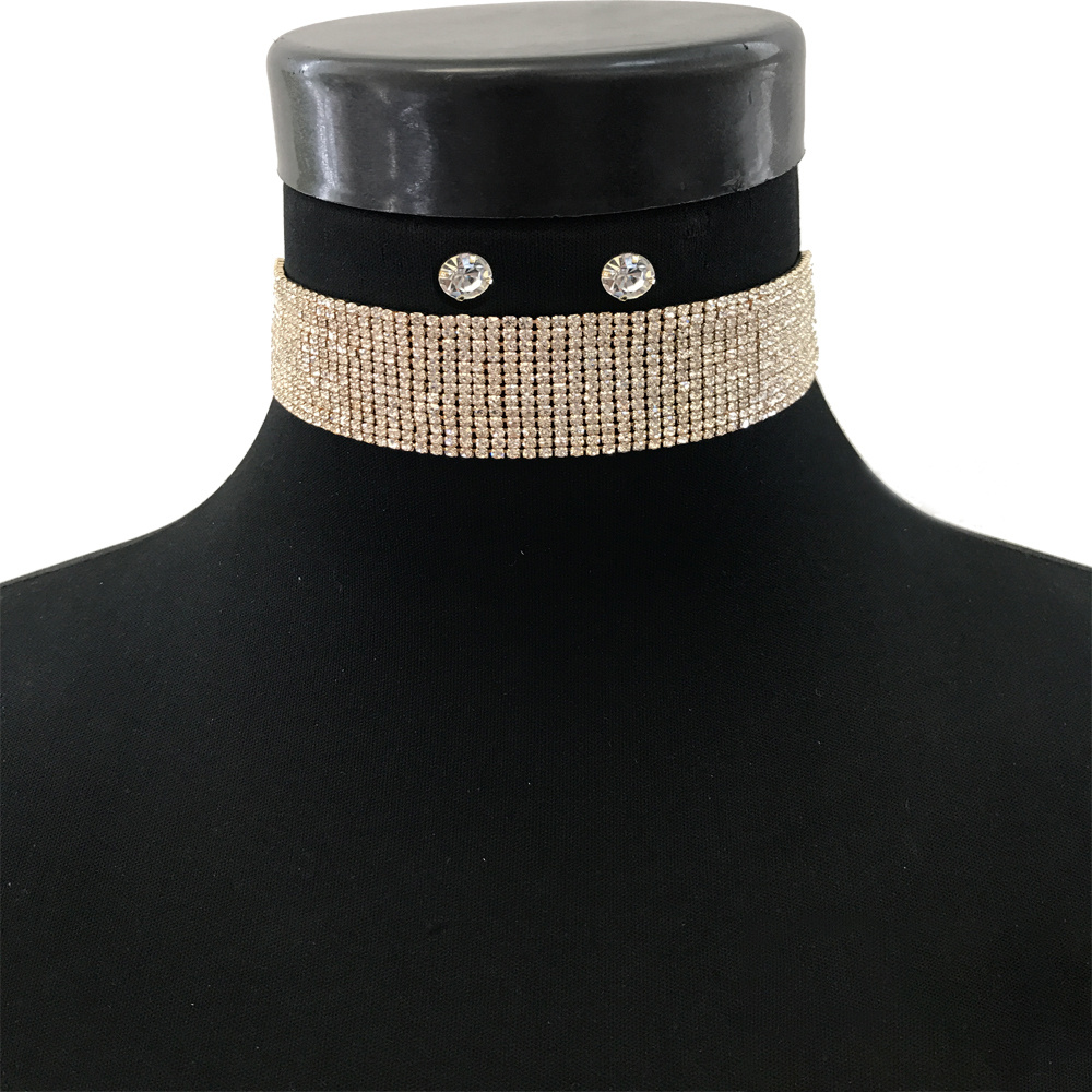 13 LINE CRYSTAL RHINESTONE CHOKER NECKLACE AND EARRINGS SET