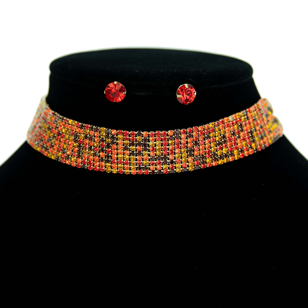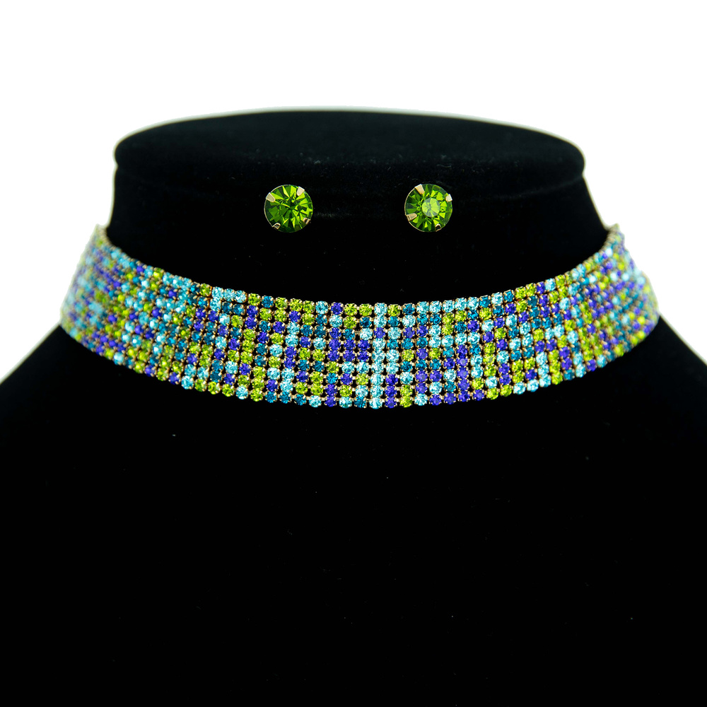 9 LINE CRYSTAL RHINESTONE CHOKER NECKLACE AND EARRINGS SET