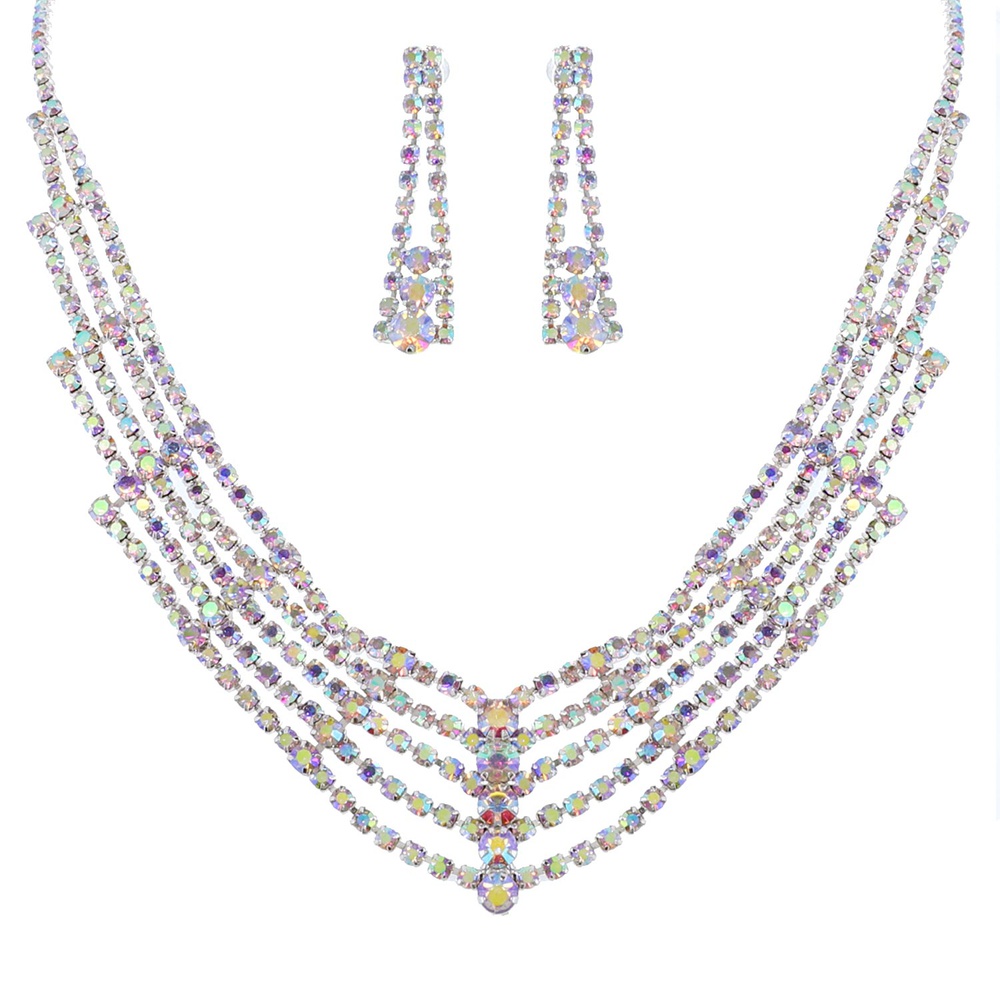 15.5" Crystal Rhinestone Multi Strand Adjustable V-shape Bib Necklace Earring Set