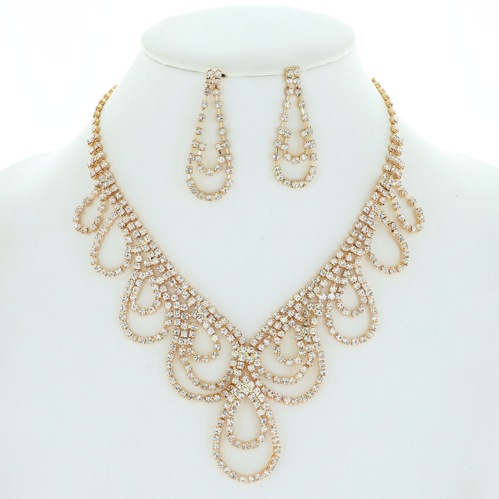VINTAGE GLAM SCALLOPED TEARDROP CRYSTAL RHINESTONE PAVE V-SHAPE NECKLACE EARRING SET