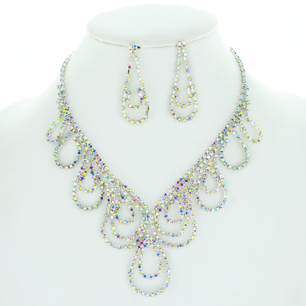 VINTAGE GLAM SCALLOPED TEARDROP CRYSTAL RHINESTONE PAVE V-SHAPE NECKLACE EARRING SET