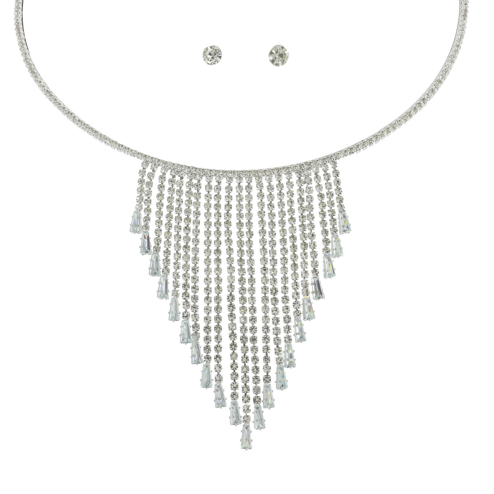 CRYSTAL RHINESTONE ADJUSTABLE TASSEL BIB NECKLACE EARRING SET