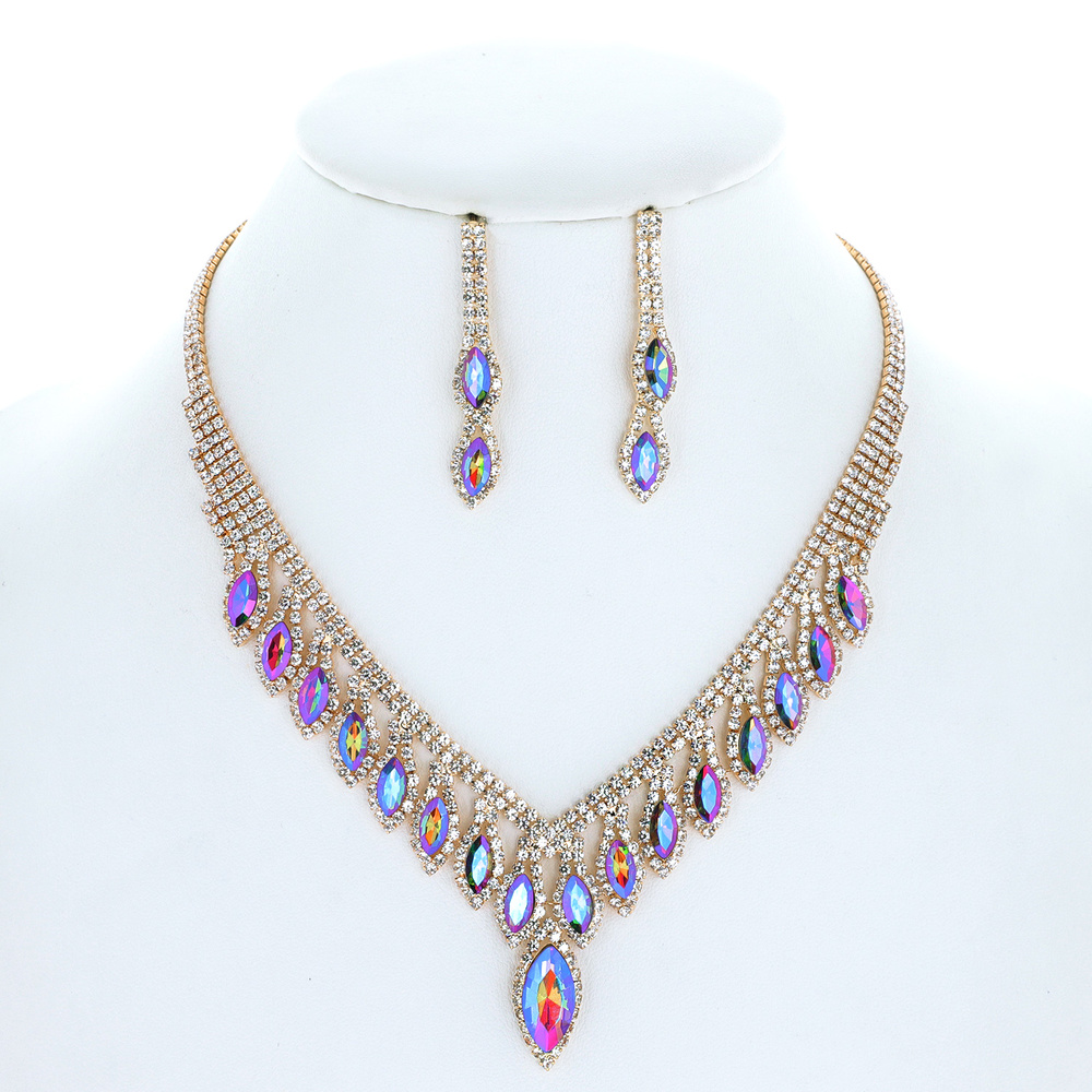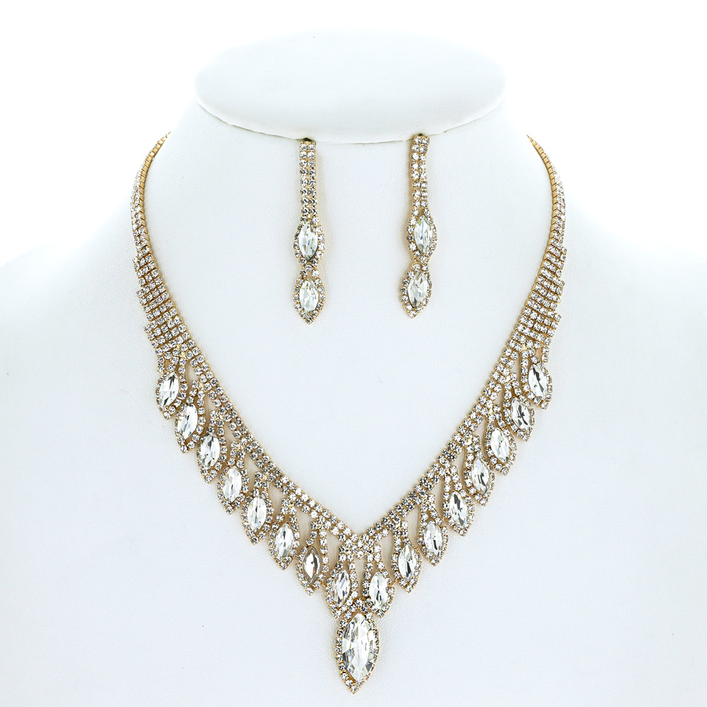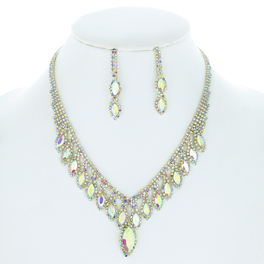 CRYSTAL PETAL V-SHAPE FRINGE ADJUSTABLE NECKLACE EARRING SET