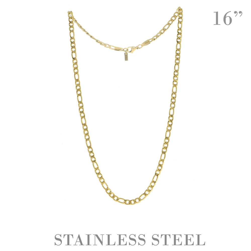 16" UNISEX FIGARO LINK CHAIN NECKLACE IN GOLD AND SILVER TONE STAINLESS STEEL METAL