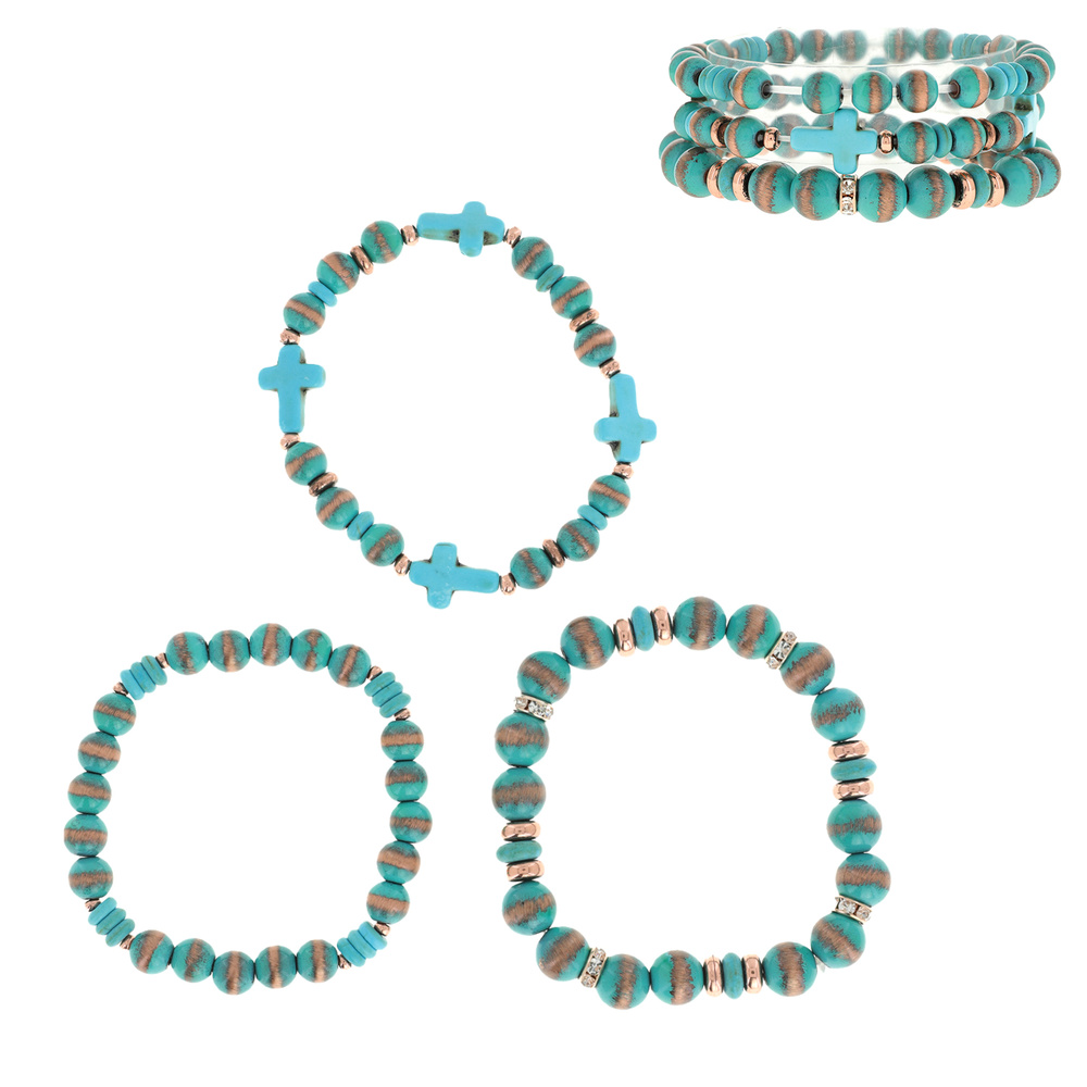3-PIECE SET SOUTHWESTERN CROSS MULTI BEAD STACKABLE STRETCH BRACELETS