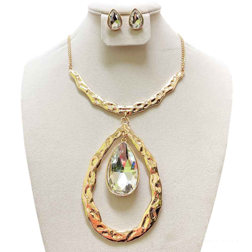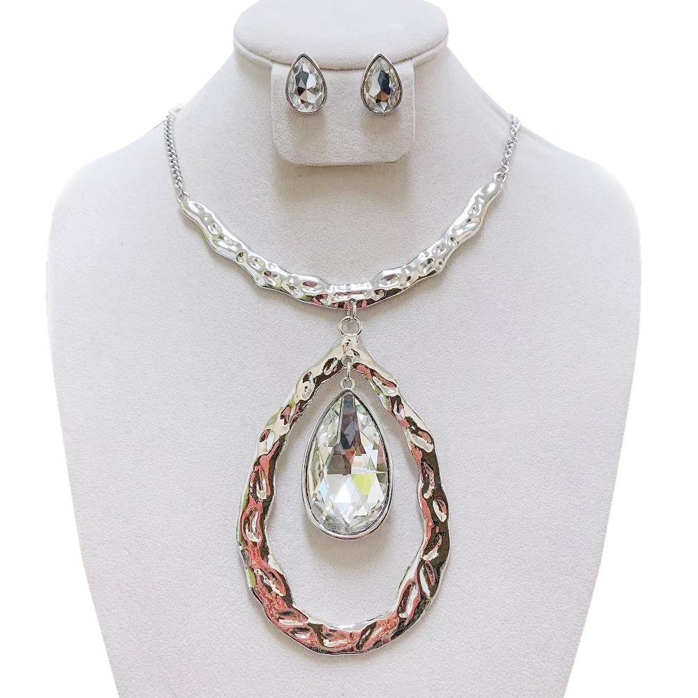 HAMMERED METAL TEARDROP PENDANT W/ CENTER STONE