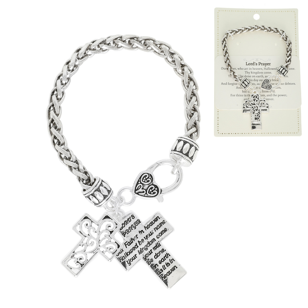 LORD'S PRAYER INSCRIBED FILIGREE CROSS CHARM WHEAT CHAIN BRACELET